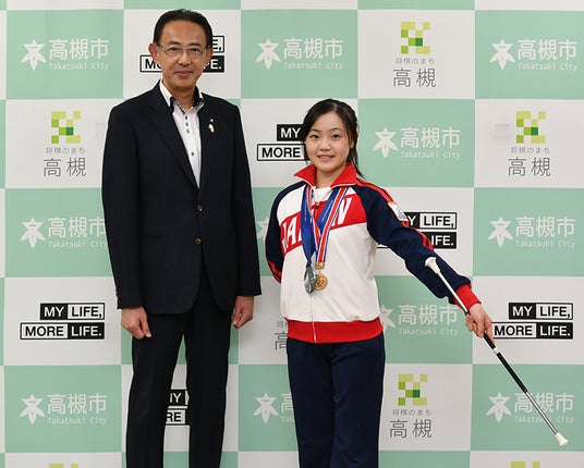 令和7年6月19日(木曜日)、高槻市在住で高校2年生の阿久根あかりさんが高槻市役所を訪問し、8月にイタリア・トレノで開催されるバトントワーリングの世界大会「2025年IBTF世界テクニカルバトントワーリング選手権大会」に、「ソロ」「アーティスティックトワール」の女子ジュニア部門で日本代表として出場することを濱田剛史市長に報告しました。