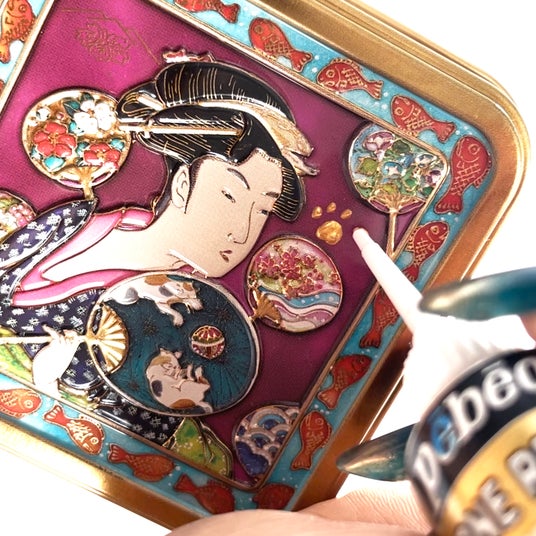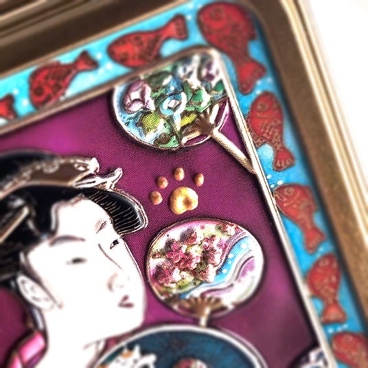 『お江戸ネコ缶』の全ての面のデザインは、グラスペイントアーティスト・Alisa Horitaによって描かれたガラス絵です。同じくAlisa Horitaが「ポッピンを吹く女」を描いた、大好評の『ポッピン缶』と『お江戸ネコ缶』を並べると、まるで姉妹のようです。