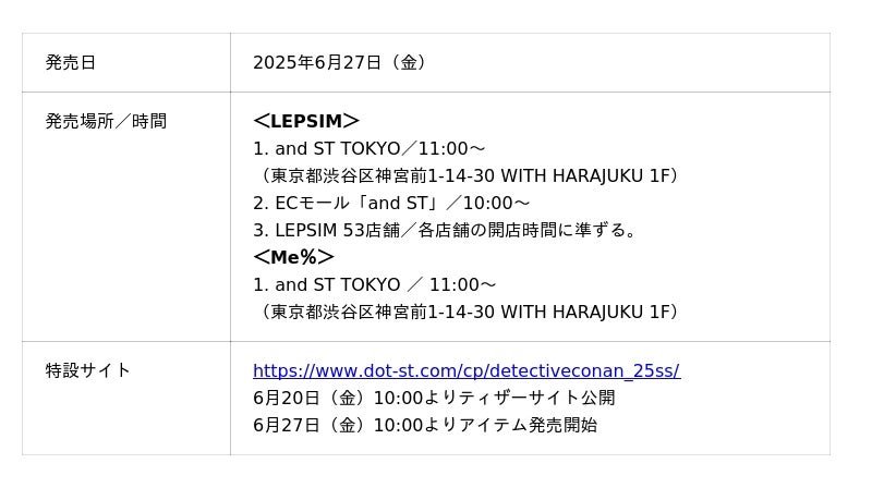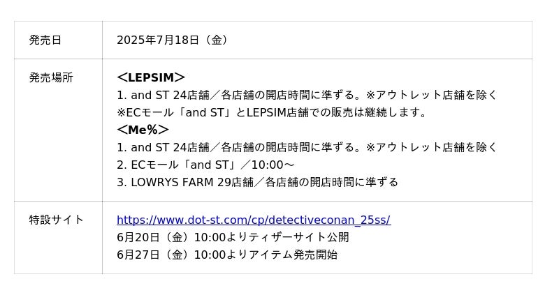 2025年6月27日(金)には、全アイテムをand ST TOKYO(原宿)にて販売いたします。また、LEPSIMの全アイテムをECモール「and ST」とLEPSIM53店舗で販売。7月18日(金)からは全アイテムをand ST全店舗(アウトレット店舗除く)で展開。さらにMe%の全アイテムをECモール「and ST」とLOWRYS FARM29店舗で販売いたします。