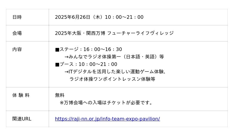 この取り組みは、ラジーンが展開する世界をつなぐ「ラジオ体操100万人プロジェクト」の一環として実施されるもので、ラジオ体操を中心に、年齢や国籍を問わず誰もが楽しく参加できる健康づくりの場を、万博会場から国内外に向けて発信することを目的としています。