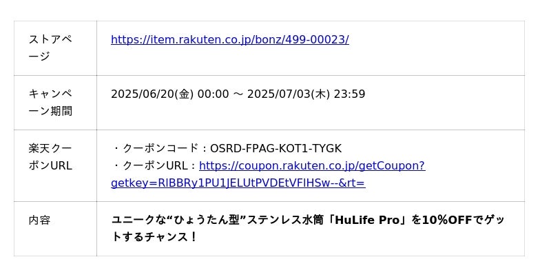 一般発売を記念して、「HuLife Pro」の取扱ネットショップ「BONZ楽天市場店」では、期間限定の割引キャンペーンを実施中。ユニークな"ひょうたん型"ステンレス水筒「HuLife Pro」は、いかがですか?