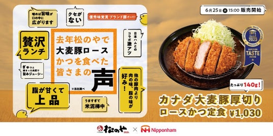 株式会社松屋フーズ(本社:東京都武蔵野市、代表取締役社長:瓦葺 一利)では、とんかつ専門店の「松のや」におきまして、2025年6月25日(水)午後3時より、「大麦豚厚切りロースかつ」を発売いたします。