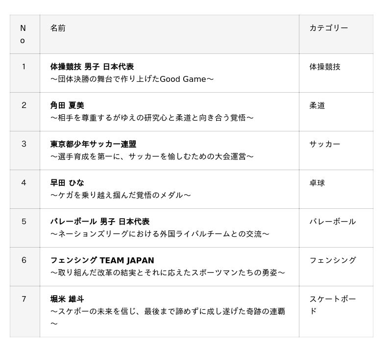 下記、日本スポーツマンシップ大賞2025のノミネート・受賞者一覧(敬称略・50音順)になります。