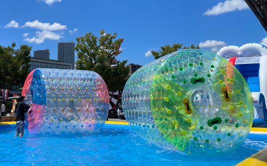 水面でくるくる転がるビッグローラーの中で子供たちが大はしゃぎします!