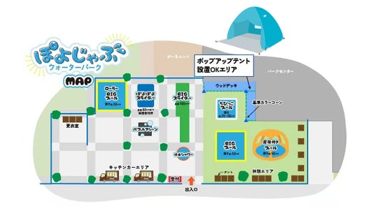 年々厳しくなる夏の猛暑対策として昨年に引き続きポップアップテントの設置OKエリア導入に加え、屋根付きの巨大ドームプールを新たに導入し、休憩エリアには常設テントを昨年の3倍、計12張りに増設いたしました。