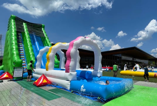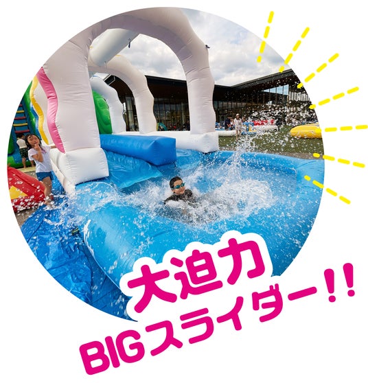 今シーズンは新アトラクションが登場! 今シーズンは、ちびっ子向けのスライダーや太陽の日差しを気にせず遊べる巨大ドームプールなど新アトラクションが登場します。一番人気の高さ9mのBIGスライダーをはじめ4種類のスライダーをお楽しみいただけます。バルーン素材のエアプールは水深が50cm以下となっておりプールデビュー前の乳幼児や泳ぐのが苦手なお子様でも安心して楽しめます。もちろん、スライダーを思いっきり楽しみたい元気なお子様にもご満足いただけるウォーターパークイベントです。ひんやりスイーツやドリンク、スタミナ満点のグルメも堪能できるキッチンカーも出店いたしますので是非、ご家族でご来場ください。