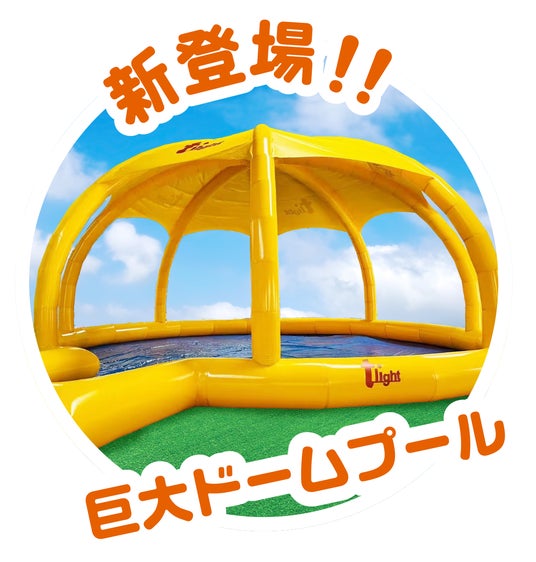 こちらも新登場!巨大ドームプール!太陽の強い日差しを防いでくれる屋根付きの巨大ドームプールが新登場!大きさは何と直径12mの超ビッグサイズ!熱中症対策としても大きな効果が期待できる新時代のエアプールです。今年のぽよじゃぶの主役はこの黄色い巨大ドームプールで決まりです。