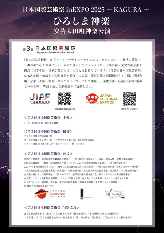 大阪・関西万博会場 ポップアップステージ 南にて開催!2025.7.2(水)~7.4(金)第3回日本国際芸術祭メイン会場イベント 安芸太田町神楽団/KURAGE Band/吟剣詩舞振興会/和太鼓政や