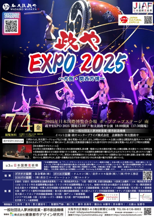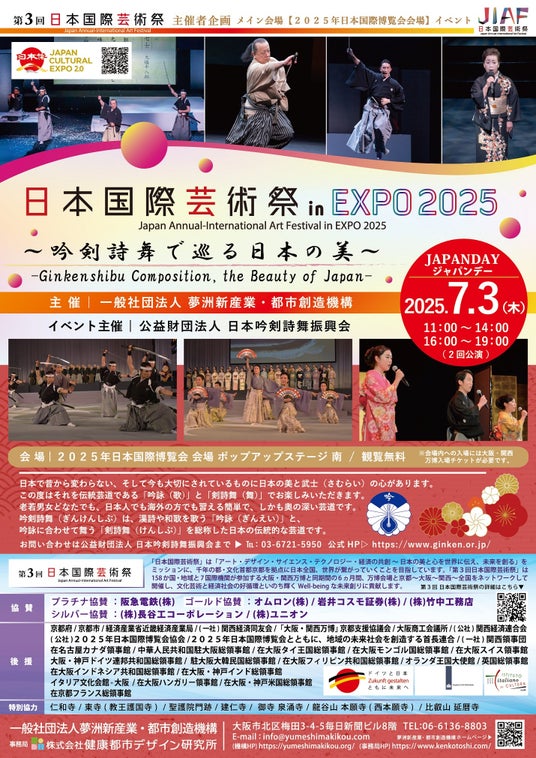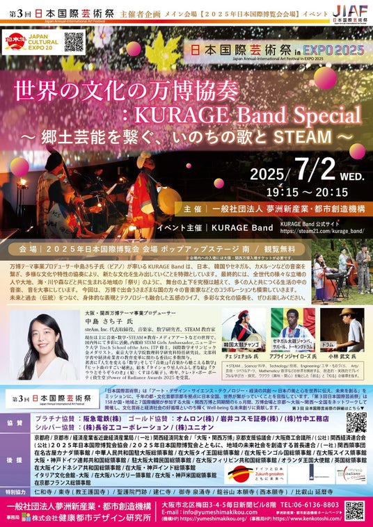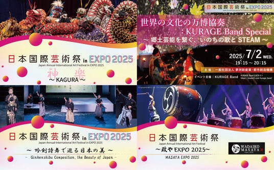 2025年日本国際博覧会 会場 ポップアップステージ 南 において、一般社団法人夢洲新産業・都市創造機構主催「日本国際芸術祭」メイン会場イベントとして、7/2(水)~7/4(金)の3日間、「日本国際芸術祭 in EXPO 2025 ~KAGURA~」「世界の文化の万博協奏:KURAGE Band Special~郷土芸能を繋ぐ、いのちの歌と STEAM~」「日本国際芸術祭 in EXPO 2025 ~吟剣詩舞で巡る日本の美~」「日本国際芸術祭 ~政やEXPO 2025~」の4ステージを開催いたします!魅力溢れる素晴らしい舞台をご用意しておりますので、是非ご来場下さいませ。
