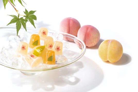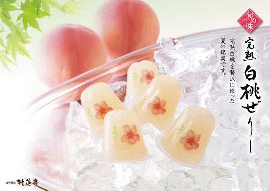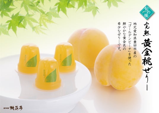 現在は愛知県産の桃にこだわって創作しており、「一番おいしい状態の桃をお菓子に仕上げたい」という完熟白桃の味に感動した創業者の思いから誕生した完熟桃ゼリー。地元愛知県産の完熟した桃を丁寧に湯むきし、果実の繊維を残す製法で完熟白桃の美味しさを追求しました。