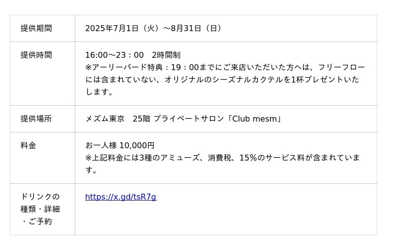 本企画は、浜離宮恩賜庭園の緑や東京湾のきらめく夜景を一望できる、ホテルの25階に位置する特別な空間で、"夜空と風を感じる贅沢な夏のひととき"をテーマに、メズム東京ならではの洗練されたホスピタリティーと「Club mesm」のコンセプトである"JAPAN FLOW"を感じながら、国産のお酒にこだわったアルコール約15種類をお楽しみいただけます。