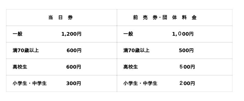 入 館 料 : 当日券 一般1,200円 満70歳以上600円 高校生600円 小・中学生300円