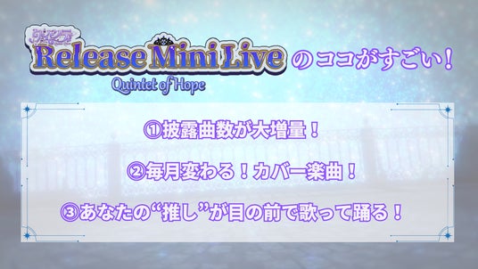 今回の『Release Mini Live ~Quintet of Hope~』では、これまでにない新たな試みが多数展開されます!1. 披露曲数が大増量!