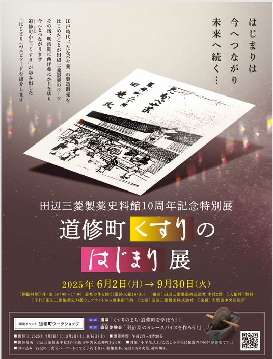 田辺三菱製薬株式会社(本社:大阪市中央区、代表取締役社長:辻村明広、以下「田辺三菱製薬」)は、6月2日(月)から、田辺三菱製薬史料館(以下「史料館」)において、開館10周年記念特別展「道修町くすりのはじまり展」と関連イベントを開催します。