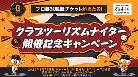 クラブツーリズム株式会社(本社:東京都江東区、代表取締役社長:酒井博、以下クラブツーリズム)は、2025年8月7日に行われる東京ドームプロ野球セントラルリーグ公式戦(読売ジャイアンツvs東京ヤクルトスワローズ)を「クラブツーリズムナイター」と銘打って開催することを記念し、2025年6月20日~2025年8月31日まで「クラブツーリズムナイター開催記念キャンペーン」を実施いたします。
