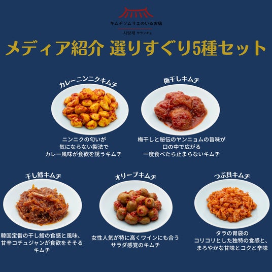 カレーニンニクキムチ、梅干しキムチ、干し鱈キムチ、オリーブキムチ、つぶ貝キムチ