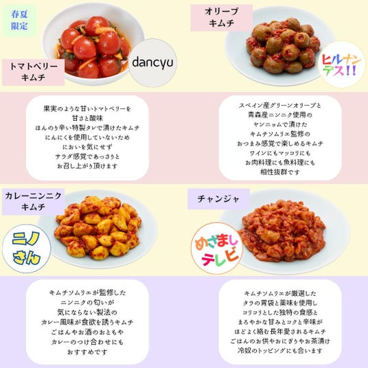【紹介商品:梅ぼしキムチ、干し鱈キムチ、カレーニンニクキムチ、水キムチ】