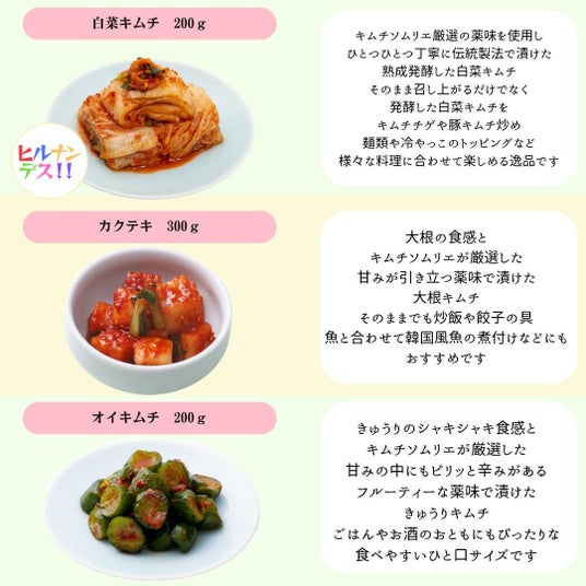 【紹介商品:ペチュキムチ、梅ぼしキムチ、セロリキムチ】