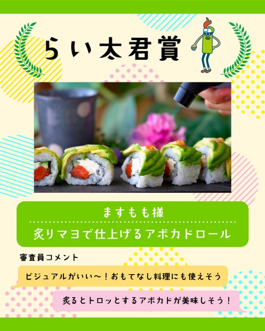 らい太君賞(賞品:Amazonギフト券 5,000円分)作品名:炙りマヨで仕上げるアボカドロール