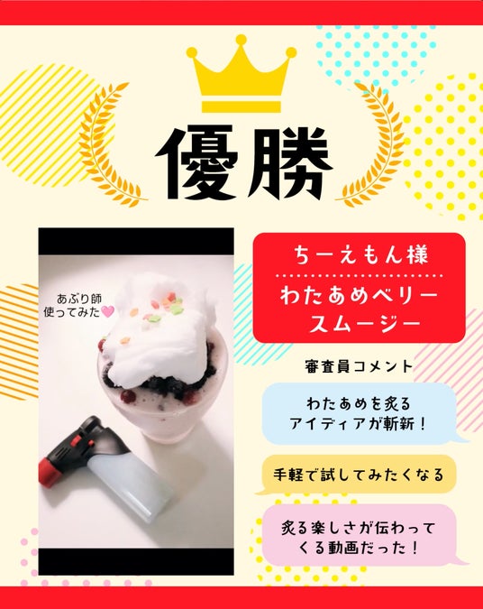 スムージーの上にわたあめを乗せて炙る、誰もが驚くような斬新なアイデアを高く評価しました。ふわふわのわたあめが炎でじゅわっと溶け、香ばしいカラメル状になってスムージーに混ざり合う様子は、まさに五感を刺激する体験です。その驚きのある発想と、動画で「炙る楽しさ」を見事に表現した点が優勝の決め手となりました。