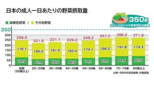野菜摂取量の目標量は1日350g以上ですが、国民健康・栄養調査調査(令和5年)によると、野菜摂取量は平均(20歳以上)で256gと、約100g足りていないという結果でした。