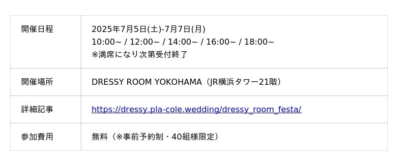 【スタートドレスフォトプレゼント中】7/5(土)-7/7(月)限定開催! 結婚準備を楽しく進めるウェディング初体験フェス開催決定 in DRESSY ROOM(横浜駅直結)