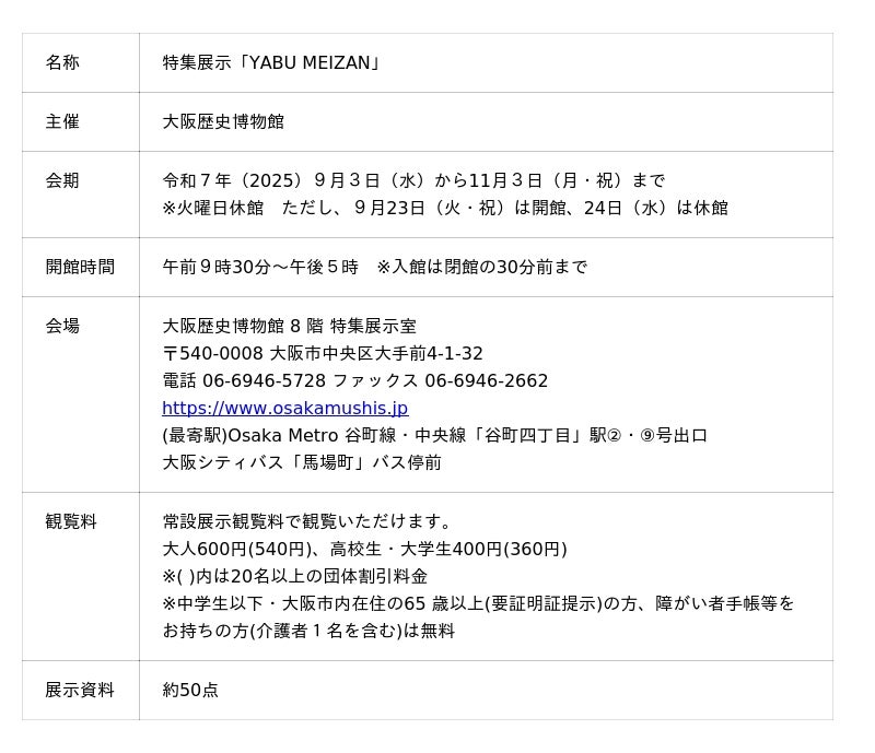 大阪歴史博物館では、令和7年(2025)9月3日(水)から11月3日(月・祝)まで、8階特集展示室において、特集展示「YABU MEIZAN」を開催します。