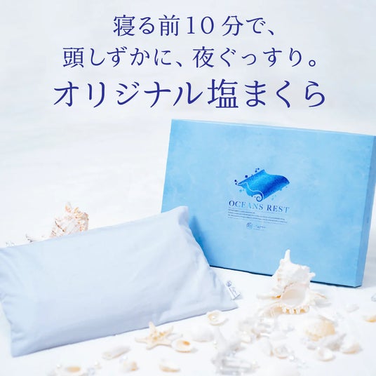 寝る前に5分~10分程度、頭部に当て、その後塩まくらを取り、通常通りお休みください。OCEANS RESTを載せたまま就寝しても問題ございません。