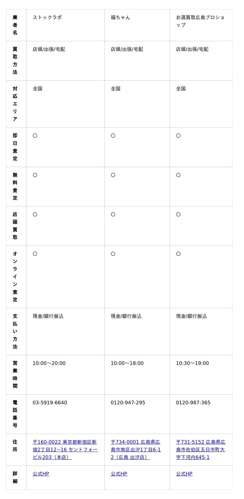 ではさっそく、広島でおすすめのお酒買取業者を9選ご紹介しましょう。初めに、今回業界する業者、および業者の営業時間や買取品目などをまとめた一覧表から見てください。