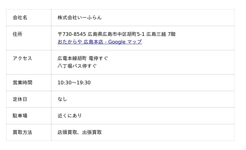 おたからやは、全国1,400店舗以上展開する国内でも屈指の大手買取店です。Google口コミで星4.8、広島本店は星5、口コミ数148と非常に高い評価を得ています。