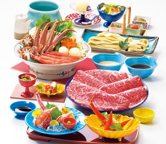 内容:牛・かにしゃぶ、茹でがに、小鉢二種、サラダ、かに刺身、きしめん、デザート