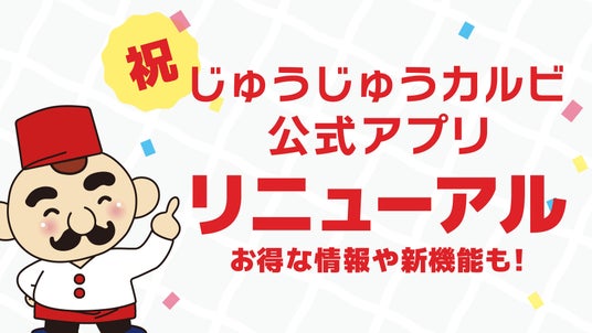 皆さまがアプリをもっと快適に、そしてもっと楽しく使えるよう、じゅうじゅうカルビの公式アプリをリニューアルいたしました。お子さまにもお楽しみいただけるようなコンテンツも新たに登場しました。