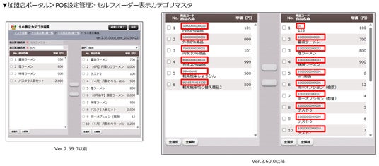 セルフオーダー表示カテゴリマスタの編集画面で商品コードが表示されるようになりました。