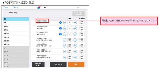 POSアプリ内の商品マスタ画面、および残数設定画面で「商品名」に加えて「商品コード」が確認できるようになりました。