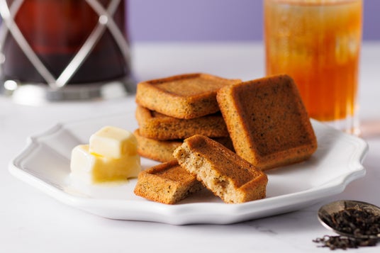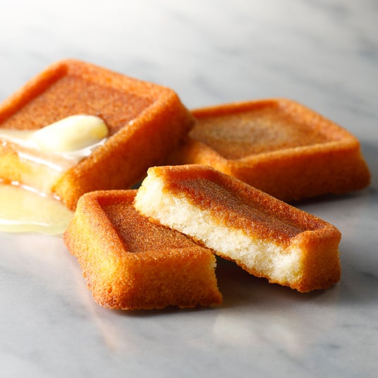 ヨーロッパ産発酵バターとアールグレイ茶葉を生地に練り込んだ、バターとベルガモットの華やかな香り漂うフィナンシェでございます。今回の発売より、イメージカラーを"ロイヤルブルー"に一新したパッケージ。上品な味わいをより印象づける、洗練された新しい装いにもご注目ください。