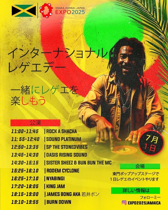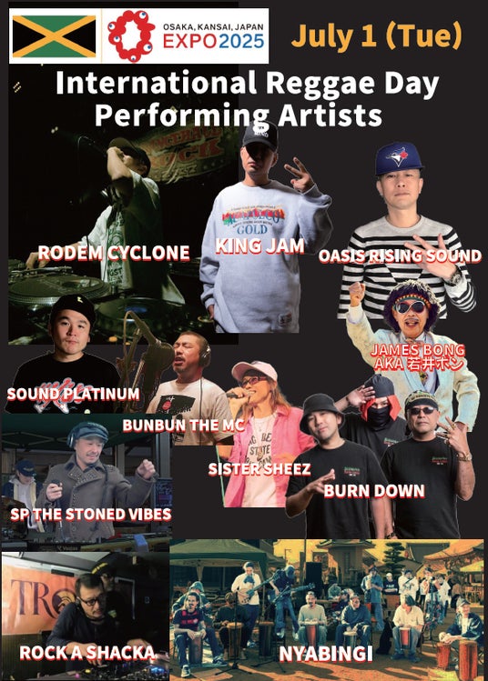 大阪・関西万博の「Commons-B」パビリオンにブース出展しているジャマイカは、インターナショナル レゲエ デーである7月1日(⽕)に、レゲエ音楽で盛り上がる自主催事イベントを開催します。出演予定アーティストは、King Jam、Oasis Rising Sound、SP the stoned vibes など総勢10組を予定しています。