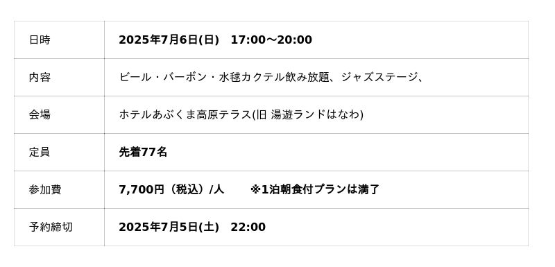 福島県東白川郡塙町の温泉浴施設「ホテルあぶくま高原テラス(旧 湯遊ランドはなわ)」内にある「森のレストラン」では、2025年7月6日(日)17時より、「一夜限りの"森のレストランJAZZ CLUB"-JAZZとビールとバーボンと-」を開催いたします。