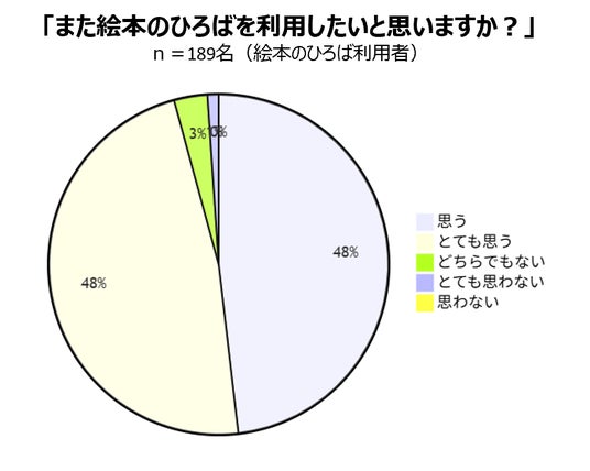 「絵本のひろば」利用者アンケートでは、来場者の約8割が未就学児を連れたファミリーであり、再来場意向は96%と、非常に高い支持を得ています。
