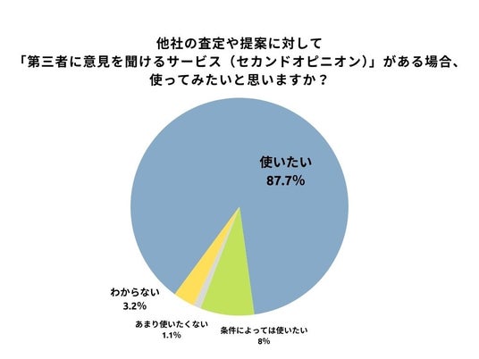 特に「価格が妥当かどうか分からない」「契約条件が不利ではないか心配」など、"判断の補助"として第三者の専門家からのアドバイスを望む声が9割を超える結果に。実際に第三者に意見を聞けるサービス(セカンドオピニオン)があれば利用してみたい人は8割以上。