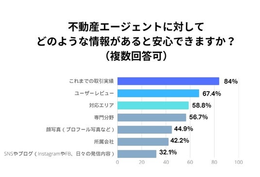 実際に不動産エージェントに対してどのような情報があると安心できるかを尋ねた設問では、最も多かった回答は「これまでの取引実績(84%)」、続いて「ユーザーレビュー(67.4%)」、「対応エリア(58.8%)」といった声が多く、過去の取引実績や評価をもとにエージェントを見極めたいというユーザーのニーズが見受けられます。ユーザーの多くは、初めてのエージェントに対して「この人は信頼できるか」「どんな案件を手がけてきたのか」といった客観的な裏付けを求めており、実績や利用者の声が大きな安心材料になっていることが明らかになりました。