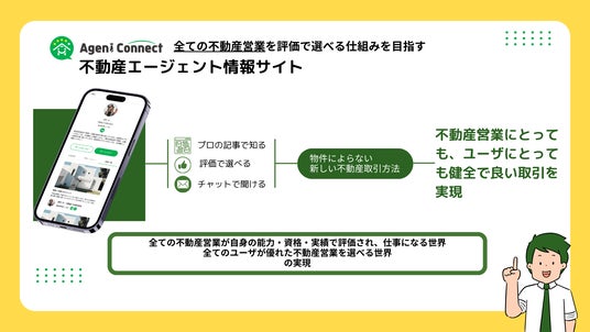 今回の調査で浮かび上がったのは、「情報が見えづらい」「誰に相談すればいいか分からない」といった、不動産取引にまつわる根深い不安や不満です。Agent Connectは、こうした声に応えるべく、エージェント選びに重点を置いた新しい不動産マッチングサービスです。主なサービスの特徴