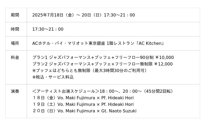 ACホテル・バイ・マリオット東京銀座(所在地:東京都中央区)では、2025年7月9日(水)に開業5周年を迎えます。日頃よりご愛顧いただいている皆さまへの感謝の意を込めて、ラグジュアリーな夏の夜を演出するスペシャルイベント「JAZZ NIGHT BUFFET」を、7月18日(金)~20日(日)の3日間限定で開催いたします。