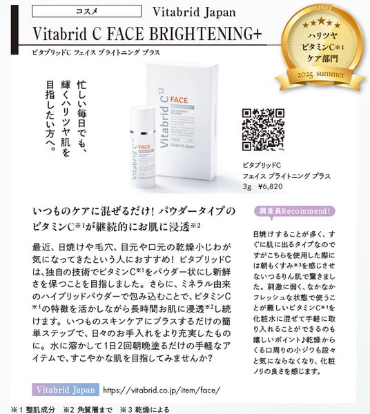 株式会社ビタブリッドジャパン(本社:東京都港区、代表取締役:大塚博史)が展開するビタミンC(※1)スキンケア製品「ビタブリッドCフェイス ブライトニング プラス」が、文藝春秋の人気ライフスタイルマガジン『CREA』2025年夏号の「5つ星美容アイテム紹介(※2)」特集において、「ハリツヤ ビタミンC(※1)ケア部門」で【5つ星】を獲得いたしました。