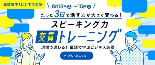 日米会話学院(東京都新宿区四谷1-6-2)は、8月13日(水)から8月15日(金)のお盆期間に「3日で英語力が大きく変わる!ビジネス英語・スピーキング力突貫トレーニング」を開催します。短期間での集中的なトレーニングを通じて、テーマ毎のビジネスシーンに特化したスピーキング力にフォーカスすることにより、ビジネスにおける現場での円滑な対応能力の向上を目的としております。