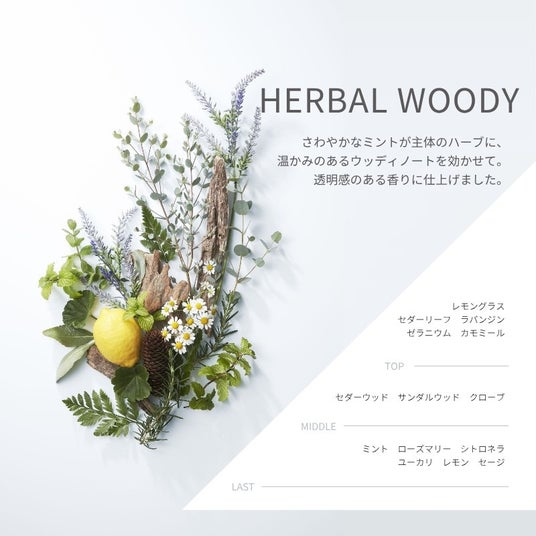 さわやかなミントを基調としたハーブに、温かみのあるウッディノートを効かせた清涼感と落ち着きを合わせ持つ香り。心安らぐような、透明感のある香りに仕上げました。