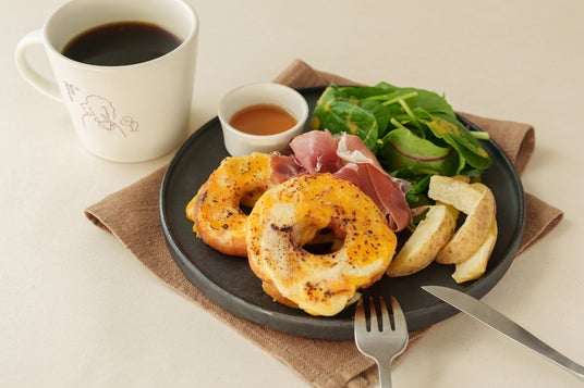 有機牛乳の自家製ホワイトソースとレッドチェダーチーズをたっぷり乗せて焼き上げた、ドーナツ形のクロックムッシュ。サイドには、手作りドレッシングをかけた有機野菜サラダと有機のポテトを添えました。有機メープルシロップや生ハムをお好みであわせてお召し上がりください。