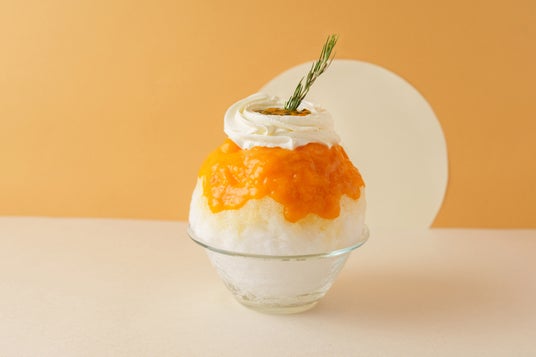 マンゴーとパッションフルーツのトロピカルなかき氷。果肉入りのマンゴーソースをかけて、コクのあるホワイトチョコクリームと酸味のあるパッションフルーツソースを乗せました。中に忍ばせたスパイシーなジンジャーシロップと、香ばしいクランブルがアクセント。