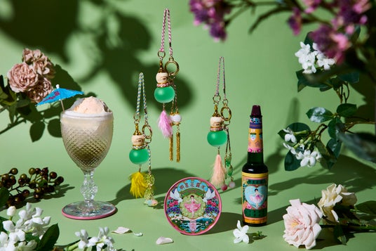 「明星花露水 」の原点である1910~1920年代"オールド上海"を感じるレトロでアイコニックなデザインモチーフと、「小楽園」の"桃源郷にある土産物屋"というエキゾチックな世界観が共鳴し合い、今回のコラボレーションが実現しました。台湾では縁起物とされる瓢箪(ひょうたん)の形をしたガラスボトルに桃や小花、タッセルなどのチャームが付いたオリジナルデザインの瓢箪聖水ボトル、小楽園らしい"どこか異国のような日本感"と、明星花露水の原点である1910~20年代頃の"オールド上海"のエッセンスが掛け合わさった限定デザインのマグネットコースター、ジャスミンが香る梅シロップのソーダ割りにココナッツアイスをのせた台湾風のクリームソーダのようなオリジナルドリンク、「ジャスミン茶梅フロート」を「明星花露水 オンラインショップ」・「小楽園 TEA SALON & BOUTIQUE」にて販売します。コラボ商品はすべて、2025年6月27日より販売開始。※「ジャスミン茶梅フロート」は小楽園でのみ販売。
