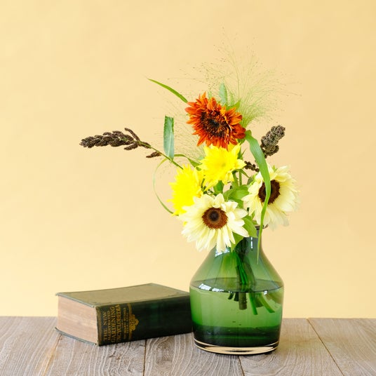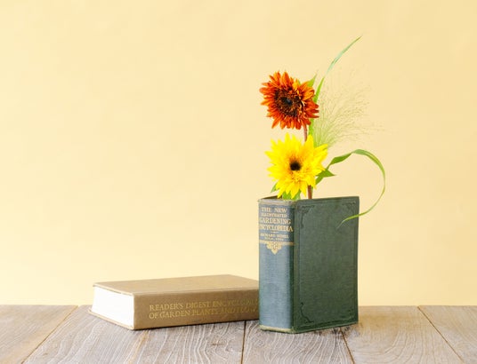 本を広げて立て、ヒマワリをいけたスリムな瓶を挟みました。自立できる厚さの本でお楽しみください。
