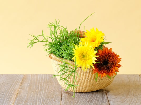 バスケットに観葉植物とコップなどに入れたヒマワリをセット。アレンジメントのような仕上がりに!